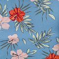 Прочный, выразительная матовая рельефная поверхность, полотняное переплетение, отлично держит форму, жестковатый на ощупь, но комфортный в изделии. Стильный вариант для платьев-футляров, сарафанов, юбок, жакетов, брюк или шорт. Льняная костюмно-плательная ткань с крупным цветочным принтом красно-коралловых оттенков на голубом фоне.
