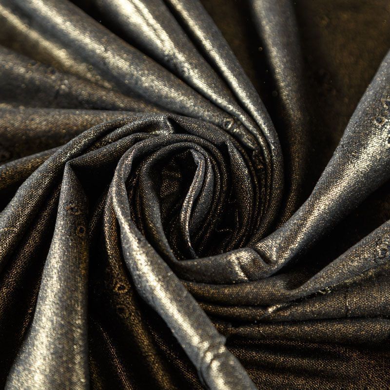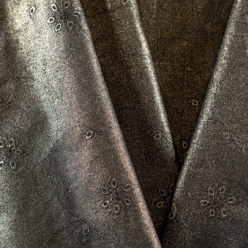 Оригинальный натуральный лен декорирован бронзовым напылением и элегантной вышивкой по всему полотну. Ткань хорошо держит форму, не жесткая, отлично драпируется, тянется за счет эластана в составе. Прекрасно подойдет для пошива летних платьев, костюмов, жакета, сарафанов, туники, юбки, рубашки, брюк и шорт.