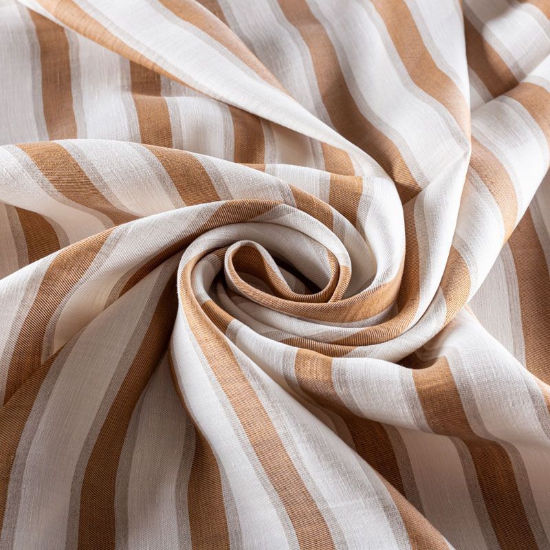 Итальянский плательно-рубашечный лен с добавлением вискозы, средней плотности, в полоску бежевых оттенков. Рисунок расположен перпердикулярно кромке. Ткань прочная, имееет выразительную матовую рельефную поверхность и полотняное переплетение, хорошо держит форму. Подойдет для пошива весенне-летних костюмов, платьев, брюк, шорт, топов, сарафанов.