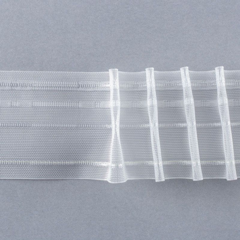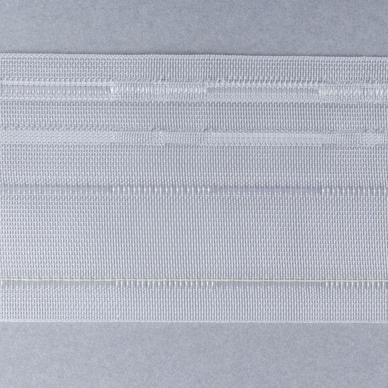 Шторная лента полностью прозрачная для тюлей и портьерных тканей с карандашной сборкой. Сокращение - 1:2,5, раппорт - 6 см, 2 ряда кармашков, крепление - крючки.