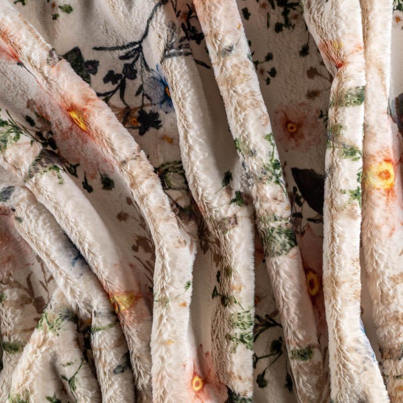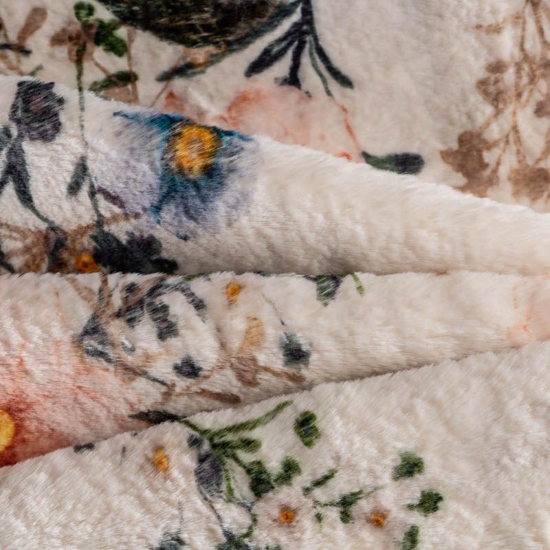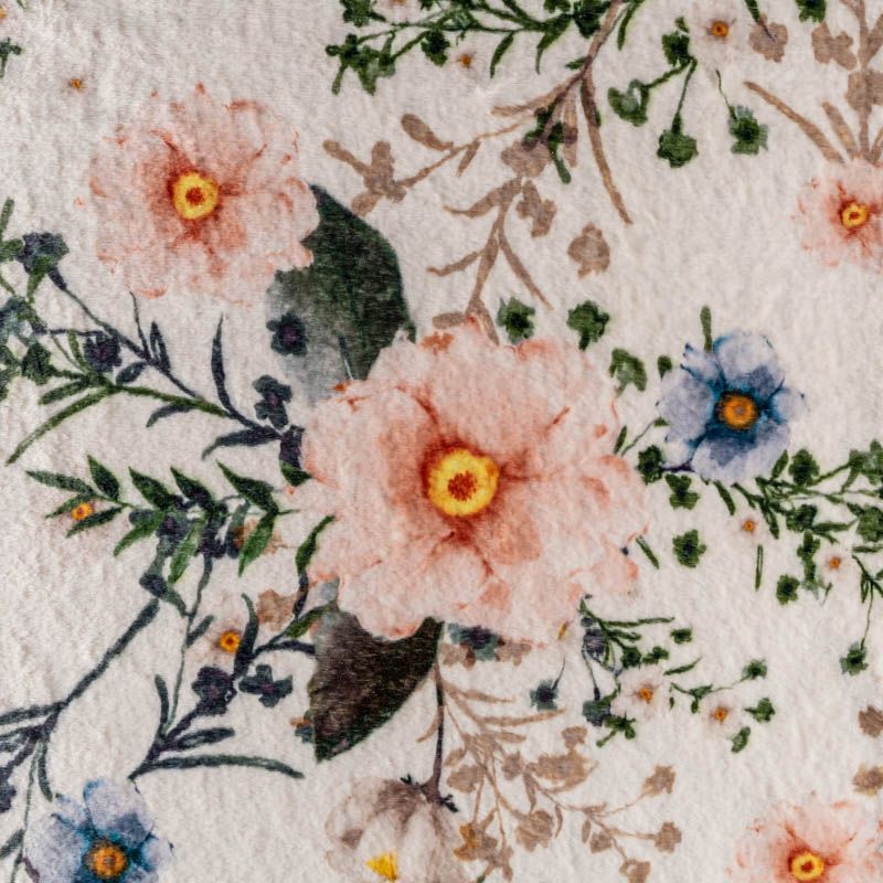 Искусственный мех, имитирующий кролика. На светлом фоне розовые, голубые, желтые цветы. Красивое гармоничное сочетание оттенков. Полотно мягкое, плюшевое, с коротким нежным ворсом. Имеет красивый лоск и приятную гладкую фактуру. Мех не мнется, не скатывается, долго сохраняет свой вид, очень уютный. Не тяжелый, отлично драпируется. Идеально подойдет для пошива шубки, мехового пальто, бомбера, куртки.
