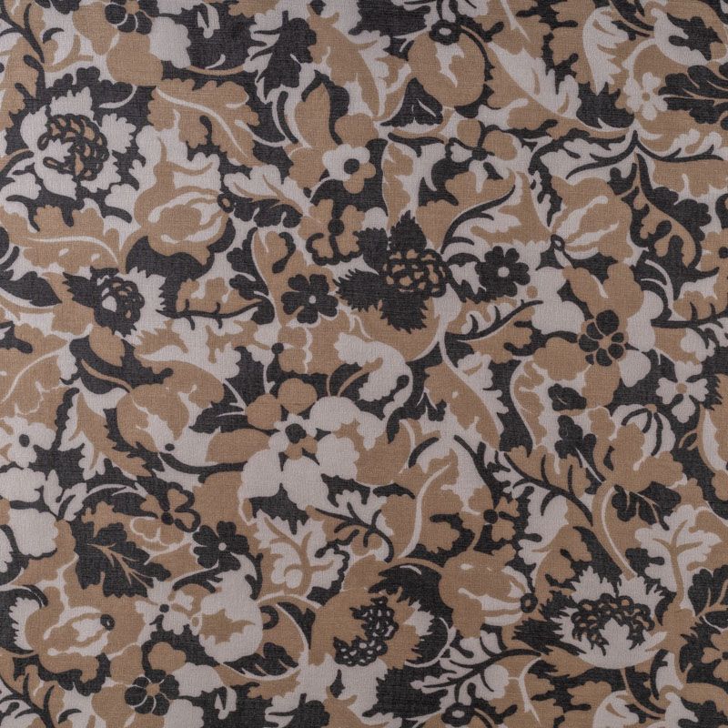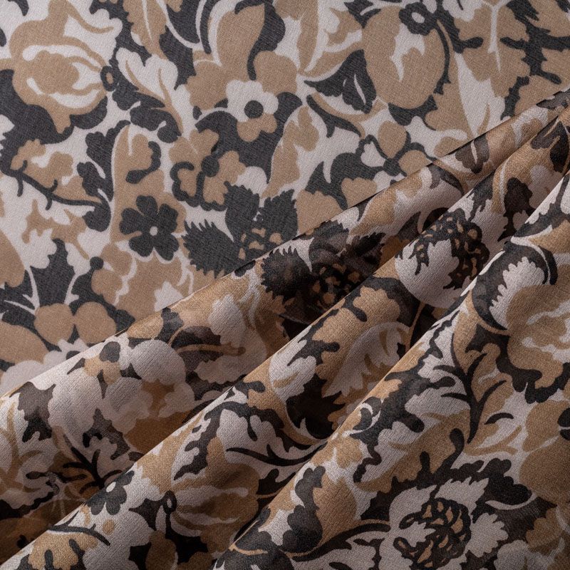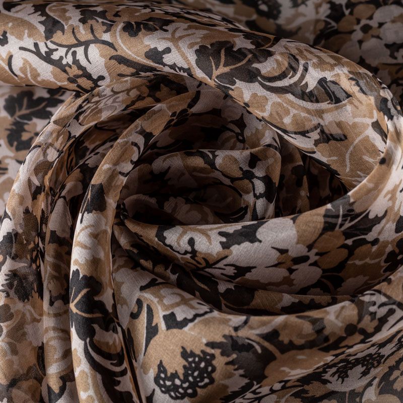 Шелковая органза с табачно-черным флористическим принтом на молочном фоне. Легкая, тонкая, пластичная, хорошо драпируется, просвечивает, отлично держит форму. Подойдет на блузку, платье, тунику или юбку на подкладе.