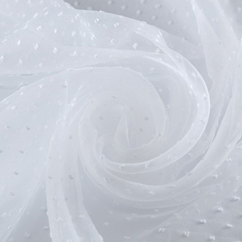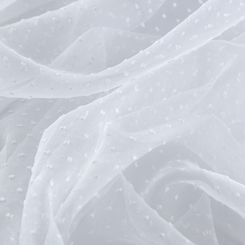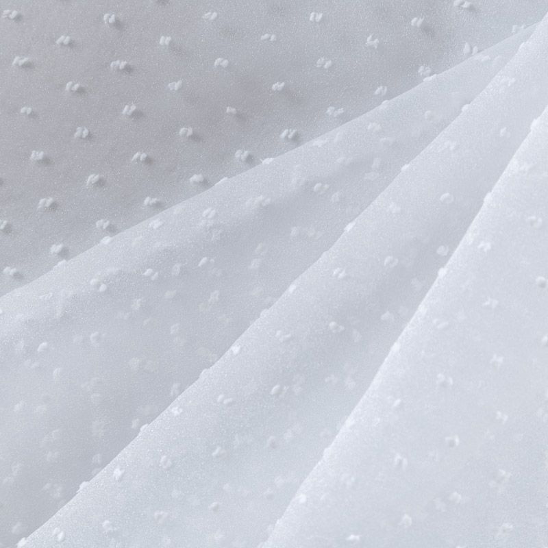 Легчайший, изящный, воздушнный и прозрачный материал с благородной переливчатой поверхностью. Прекрасно держит форму в заложеных складках. На лицевой стороне объемные декоративные элементы из флока диаметром 0.5 см. Подойдет для создания в изделии декоративных деталей, новогодних костюмов, нарядных платьев, блузок.