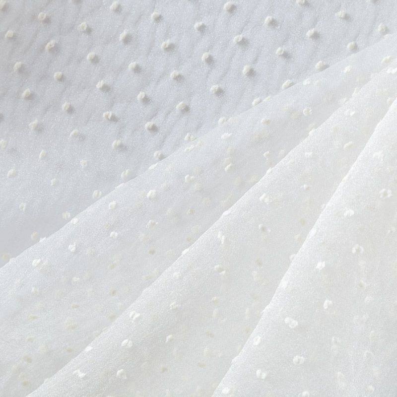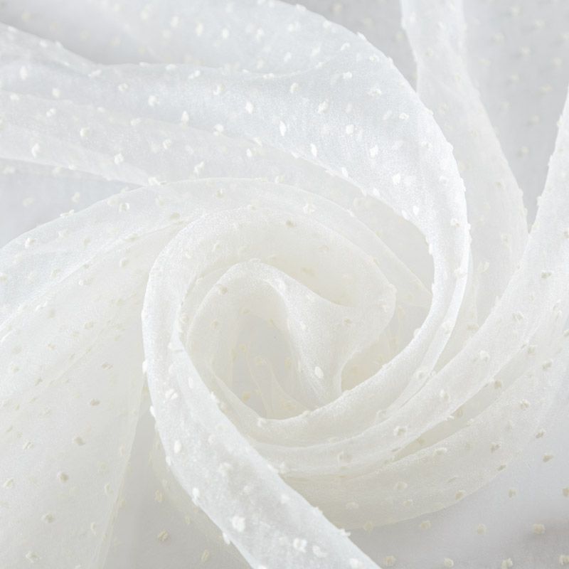 Легчайший, изящный, воздушнный и прозрачный материал с благородной переливчатой поверхностью. Прекрасно держит форму в заложеных складках. На лицевой стороне объемные декоративные элементы из флока диаметром 0.5 см. Подойдет для создания в изделии декоративных деталей, новогодних костюмов, нарядных платьев, блузок.