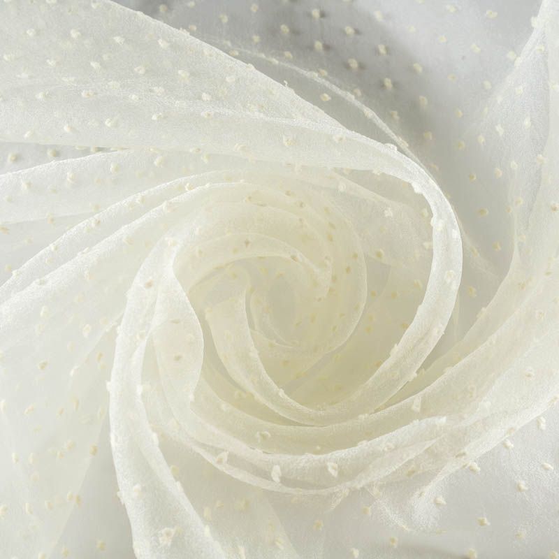 Легчайший, изящный, воздушнный и прозрачный материал с благородной переливчатой поверхностью. Прекрасно держит форму в заложеных складках. На лицевой стороне объемные декоративные элементы из флока диаметром 0.5 см. Подойдет для создания в изделии декоративных деталей, новогодних костюмов, нарядных платьев, блузок.