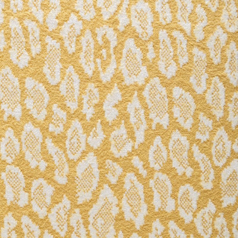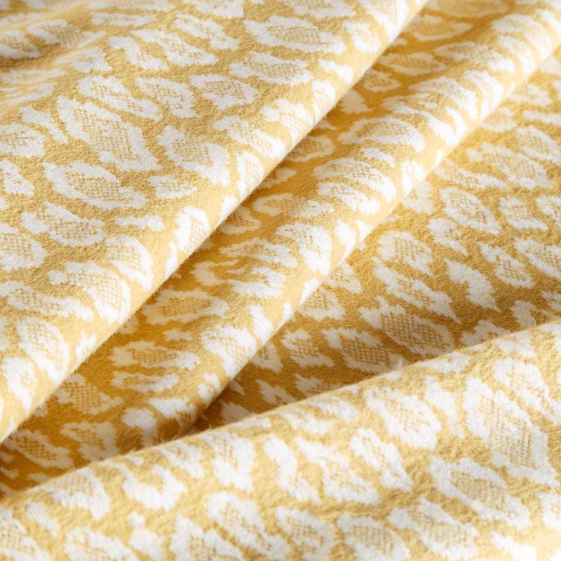 Плотный двухслойный пальтовый трикотаж желтого оттенка со стилизованным анималистическим узором белого цвета. Ткань очень приятная на ощупь, пластичная, теплая и уютная, поверхность мягкая и шелковистая. Изнанка однотонная молочного оттенка. Прекрасно подойдет для пошива пальто, теплых жакетов, курток, кардиганов, костюмов.