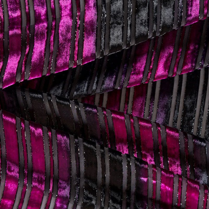 Итальянская шелковая красивая и эффектная ткань с гладким, немного глянцевым ворсовым узором на матовой шифоновой основе черного цвета. Панбархат тонкий, но объемный за счет рельефности рисунка, при драпировке ложится мягкими струящимися складками. Отлично подойдет для пошива блузы, туники, платья, костюма в пижамном стиле.
