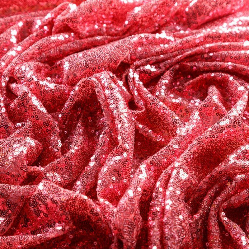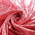 Блестящие пайетки в клубничном оттенке. Мелкие, размером около 3 мм, расположены в хаотичном порядке. Основа - мягкая и эластичная сетка.  Ткань полупрозрачная, может потребоваться подклад. Подойдет для вечернего, коктейльного платья, юбки, нарядных детских изделий, танцевальных и сценических костюмов.