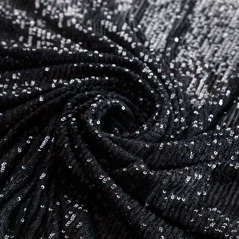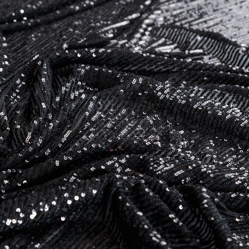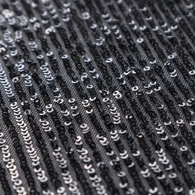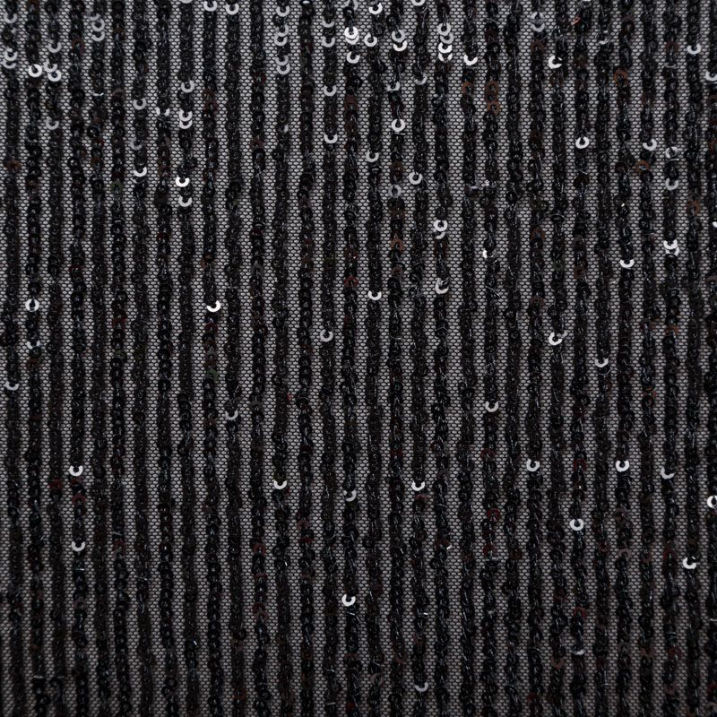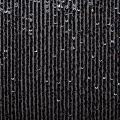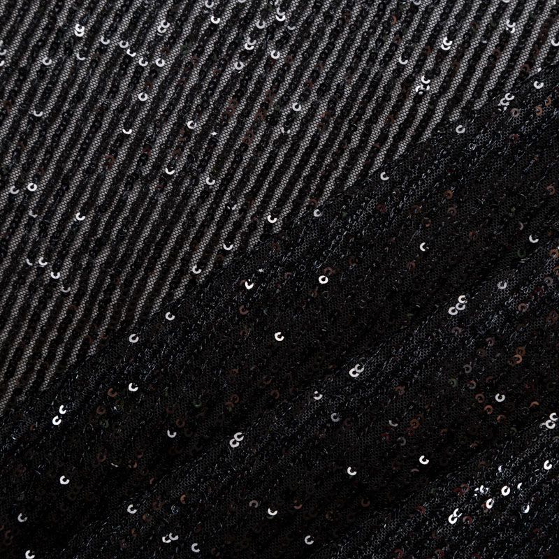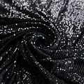 Тонкая эластичная сетка черного цвета расшита мелкими глянцевыми пайетками в тон основе, которые формируют полоски от кромки до кромки по ширине материала. Ткань очень хорошо драпируется, красиво переливается, пластичная и эластичная и в длину, и в ширину, благодаря чему изделия получаются комфортными и отлично сидят по фигуре. Пайетки — идеальный материал для праздников и вечеринок. Из них получится эффектное платье, жакет, боди, топ, туника, юбка или комбинезон.