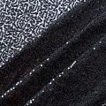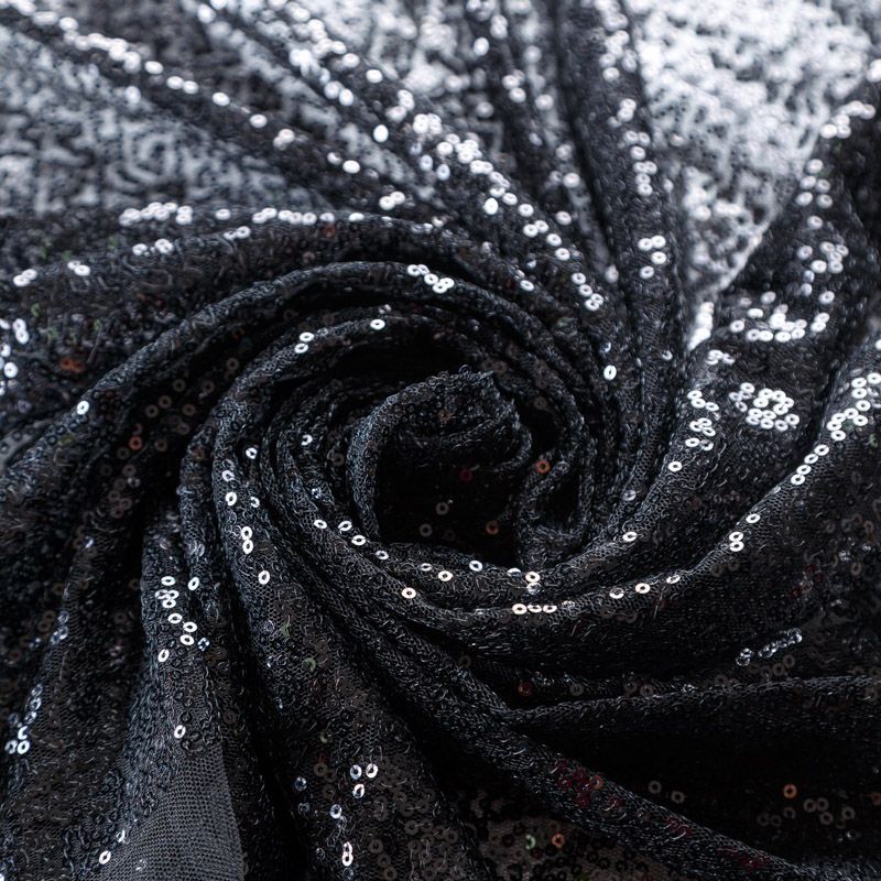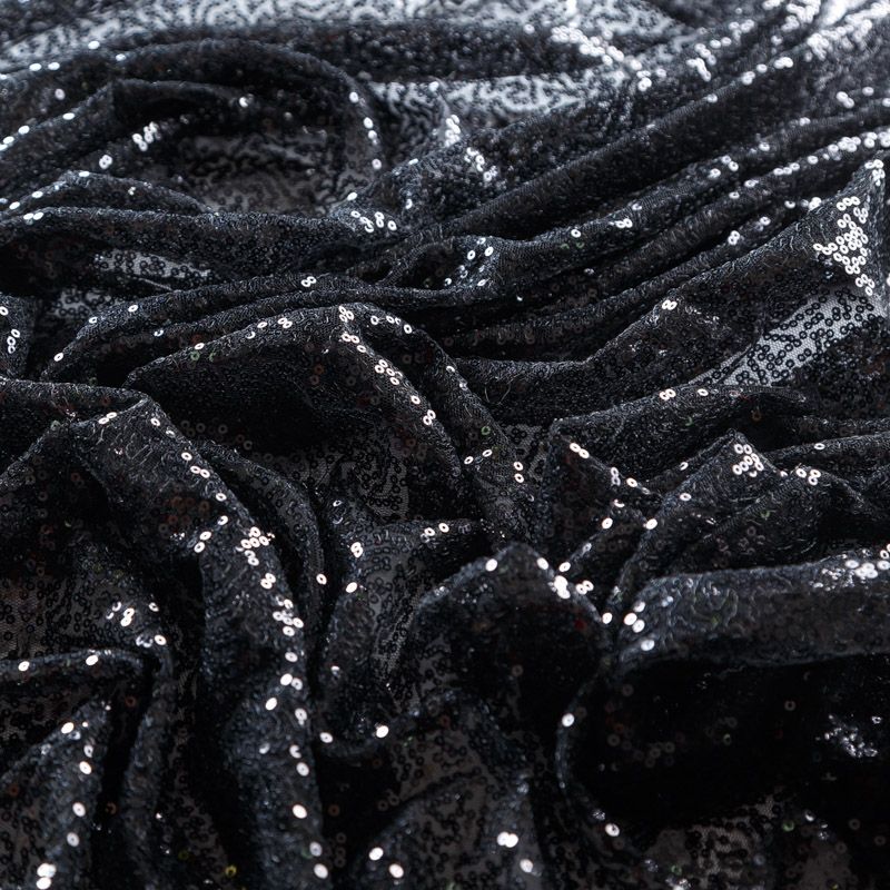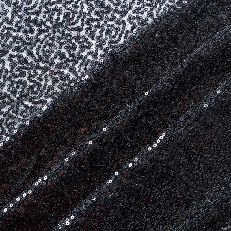 Тонкая эластичная сетка черного цвета расшита мелкими глянцевыми пайетками в тон основе. Ткань очень хорошо драпируется, красиво переливается, пластичная и эластичная и в длину, и в ширину, благодаря чему изделия получаются комфортными и отлично сидят по фигуре. Пайетки — идеальный материал для праздников и вечеринок. Из них получится эффектное платье, жакет, боди, топ, туника, юбка или комбинезон.