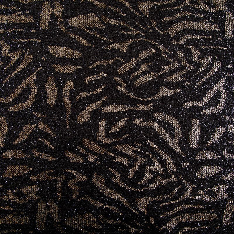Итальянские пайетки на трикотажной основе с люрексовой нитью с абстрактным черно-золотым принтом. Полотно не много рыхлое, пластичное, тянется, не просвечивает, хорошо драпируется. Подойдет для пошива платьев, юбки, комбинезона, топа, лонгслива, боди.