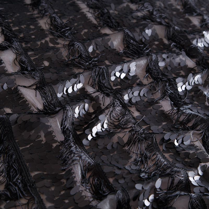 Итальянские пайетки на сетке с бахромой. Горизонтальные полоски пришитых матовых пайеток чередуются с мягкой бахромой. Сетка не тянется, требуется подклад.