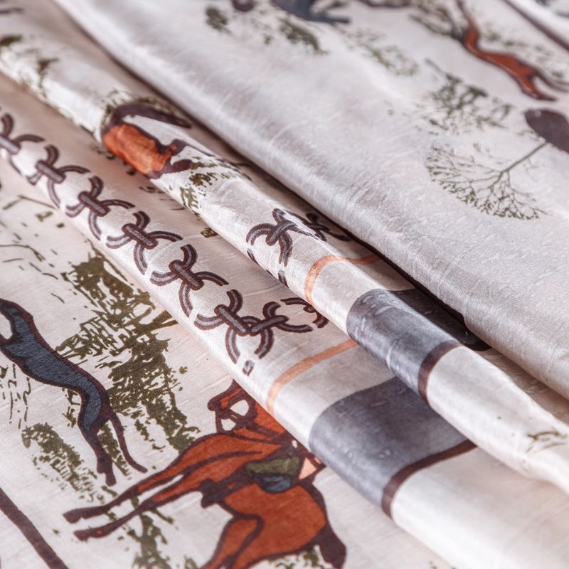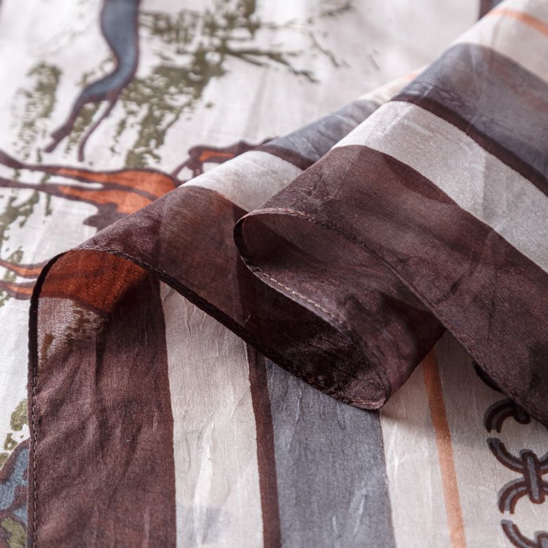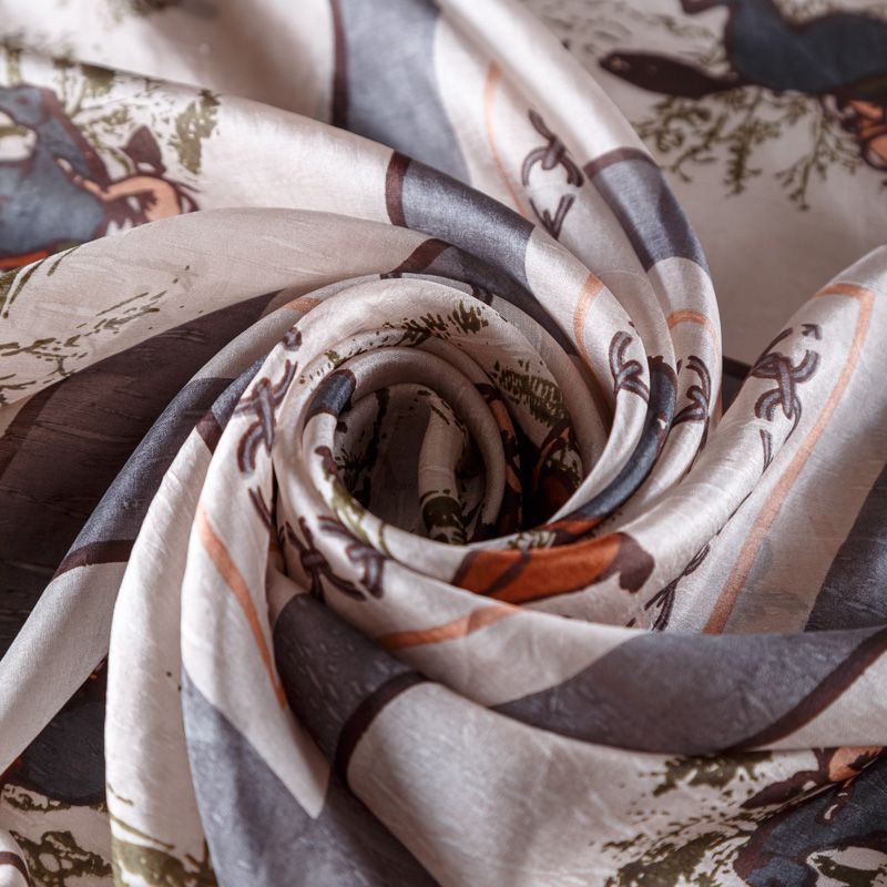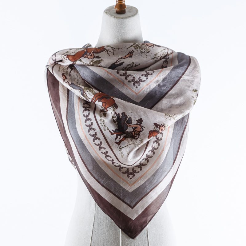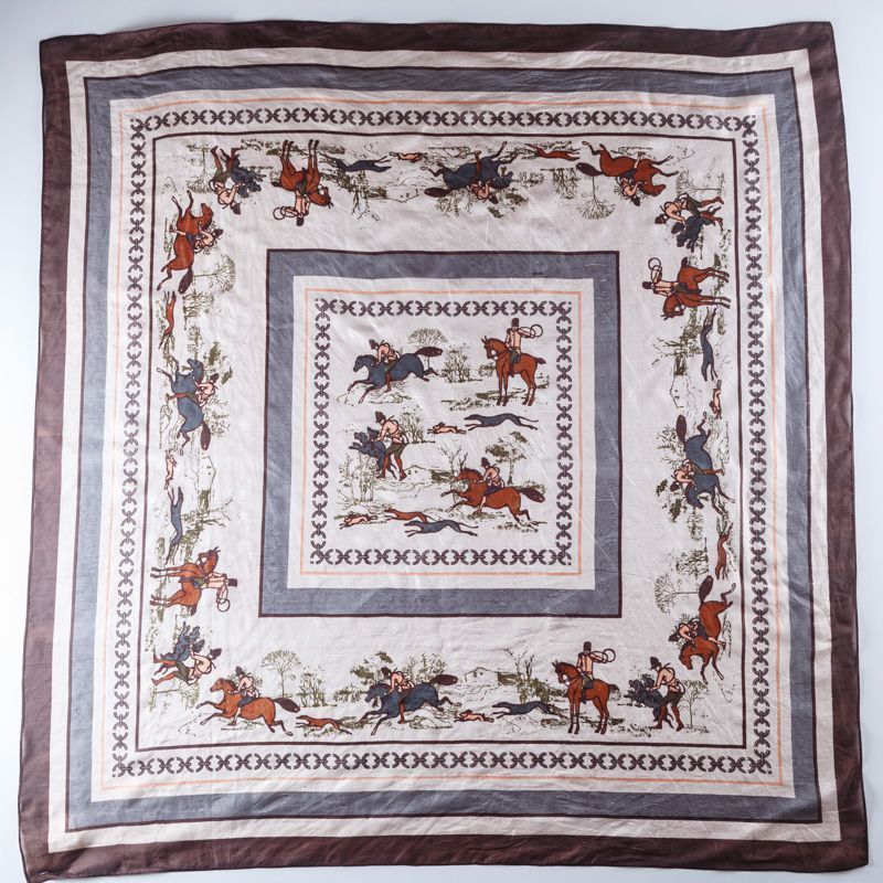 Шелковый платок в классическом стиле с изображением сюжета охоты на лошадях, цепочки и канта по периметру. Очень красиво драпируется, прозрачный, воздушный, отличный размер. Послужит прекрасным дополнением к наряду в стиле casual, одинаково выигрышно будет смотреться с костюмом или с джинсами.