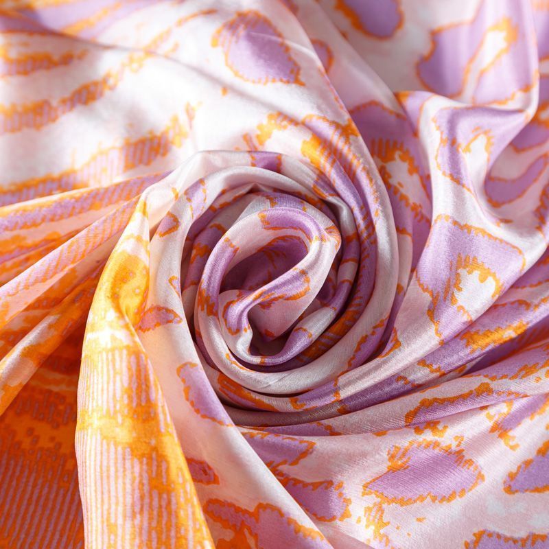 Изящный, нежный и необыкновенный шарф из итальянского шелкового шифона с крупным анималистичным принтом "зебра" в ярких оранжевых и фиолетовых тонах на молочном фоне. Невесомый, воздушный, мягкий и пластичный, летящий, поверхность с красивым матовым блеском. Будет отличным стильным аксессуаром к платью, костюму, пальто, жакету.
