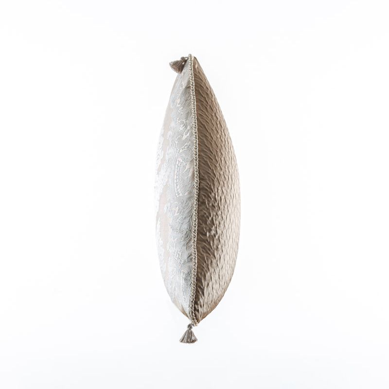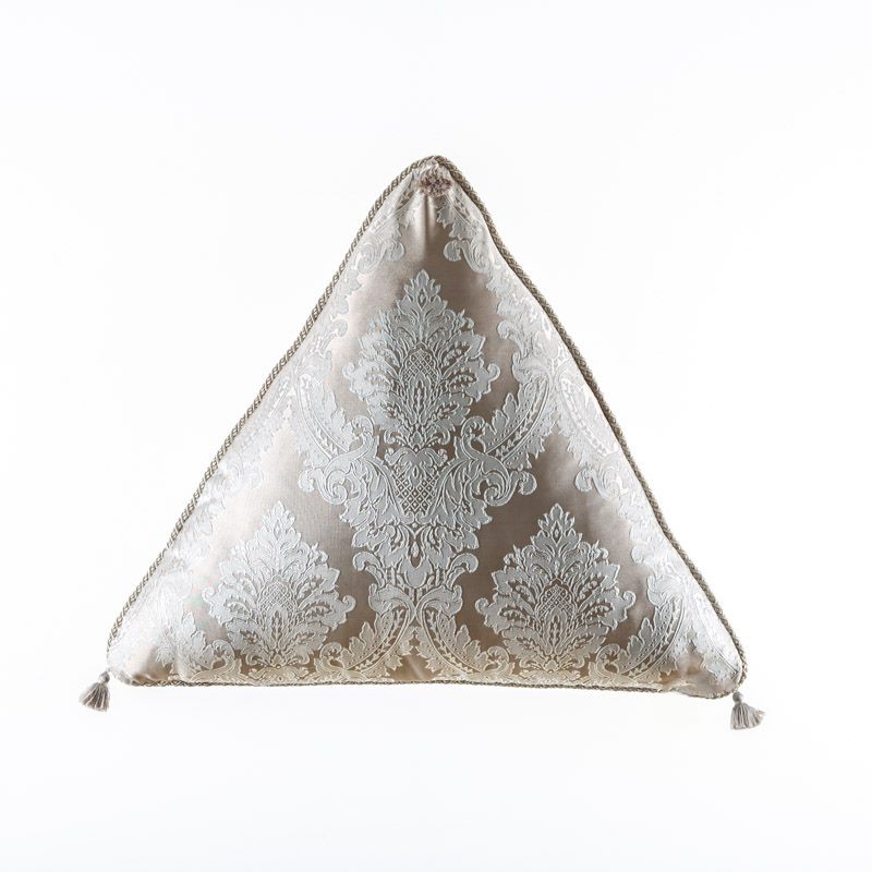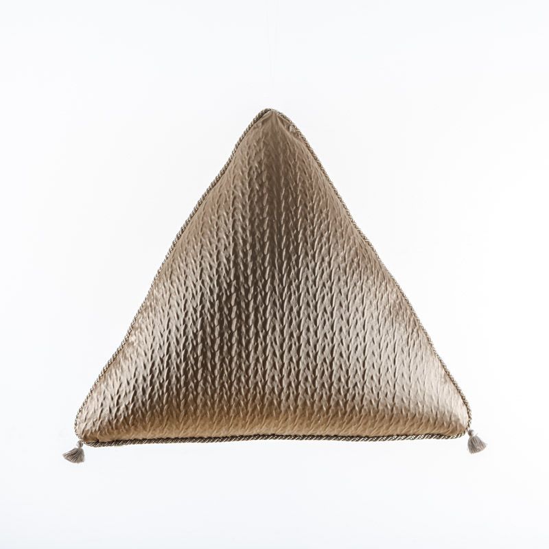 Оригинальная треугольная дизайнерская подушка 55х55х55 см. Выполнена из жаккарда и декорирована кисточками и витым шнуром. Потайная молния расположена в нижнем шве. Декоративные подушки сделают акцет на цветовой гамме Вашего помещения, подчеркнут особенности интерьерного стиля или тематику оформления. Внутреннее наполнение синтепон в хлопковом чехле.