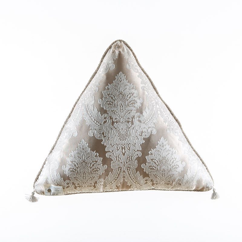 Оригинальная треугольная дизайнерская подушка 55х55х55 см. Выполнена из жаккарда и декорирована кисточками и витым шнуром. Потайная молния расположена в нижнем шве. Декоративные подушки сделают акцет на цветовой гамме Вашего помещения, подчеркнут особенности интерьерного стиля или тематику оформления. Внутреннее наполнение синтепон в хлопковом чехле.