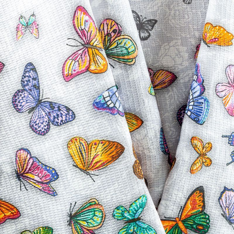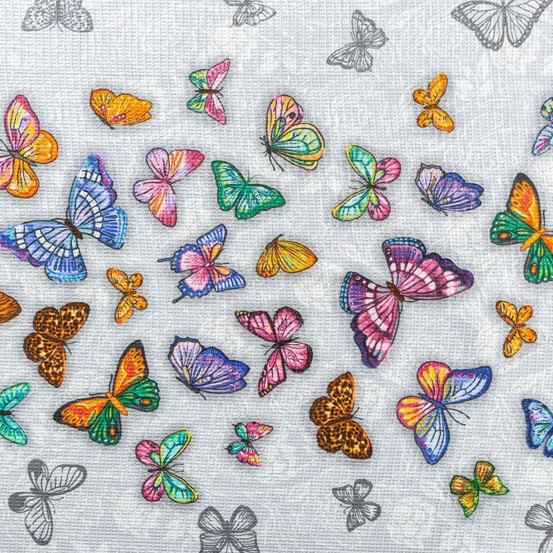 Качественная натуральная хлопчатобумажная ткань, обладающая высокой гигроскопичностью, с яркими бабочками на светло-сером фоне. Универсальный материал, из которого шьют кухонные полотенца, скатерти, прихватки, салфетки.