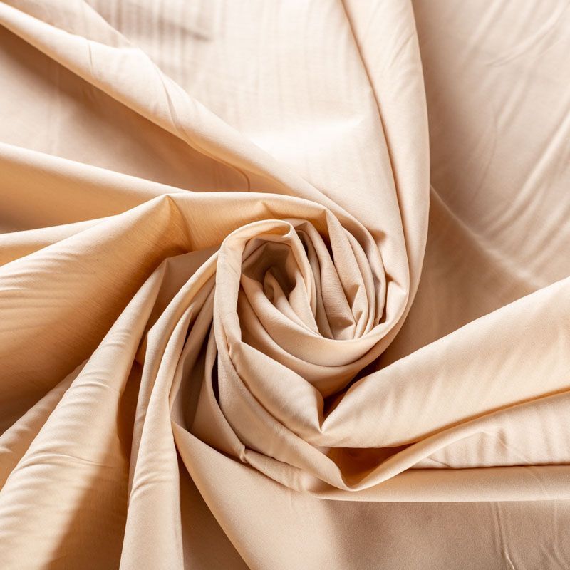 Однотонный плательно-рубашечный хлопковый поплин бежевого оттенка. Ткань лёгкая, слегка прозрачная, поверхность матовая, гладкая, приятная к телу, хорошо драпируется, тянется за счет эластана в составе. Прекрасно подойдет блузы, платья-рубашки, летнего сарафана, туники.