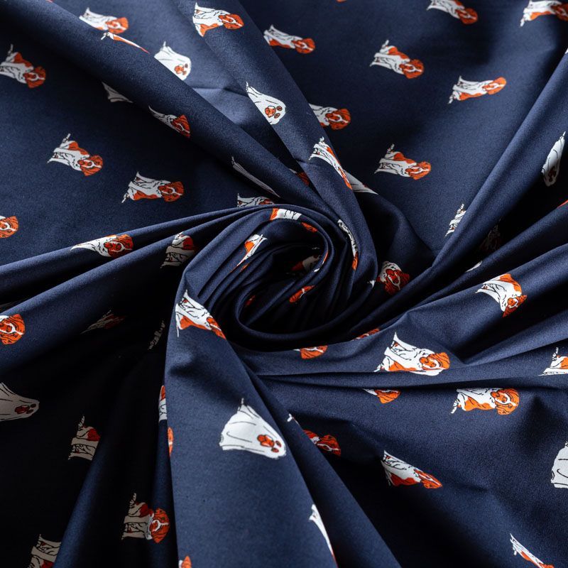 Плательно-рубашечный хлопковый поплин темно-синего оттенка с милым стилизованным принтом. Ткань лёгкая, не прозрачная, поверхность матовая, гладкая, приятная к телу, хорошо драпируется, тянется за счет эластана в составе. Прекрасно подойдет рубашки, блузы, платья-рубашки, летнего сарафана, туники, юбки.