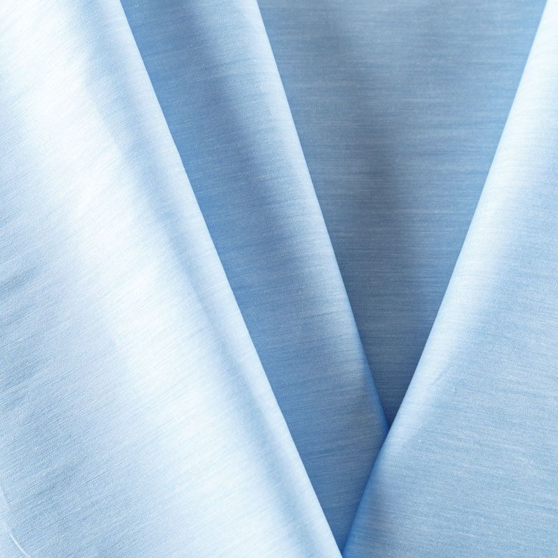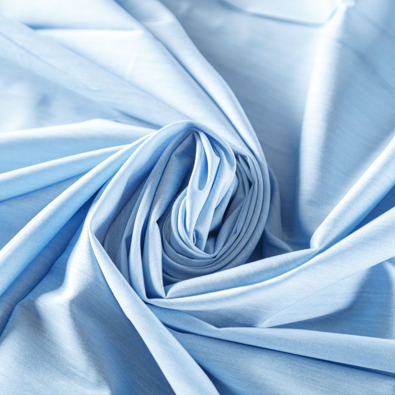 Однотонный плательно-рубашечный смесовый поплин светло-голубого оттенка. Ткань лёгкая, слегка прозрачная, поверхность матовая, гладкая, приятная к телу, хорошо драпируется, тянется за счет эластана в составе. Прекрасно подойдет блузы, платья-рубашки, летнего сарафана, туники.
