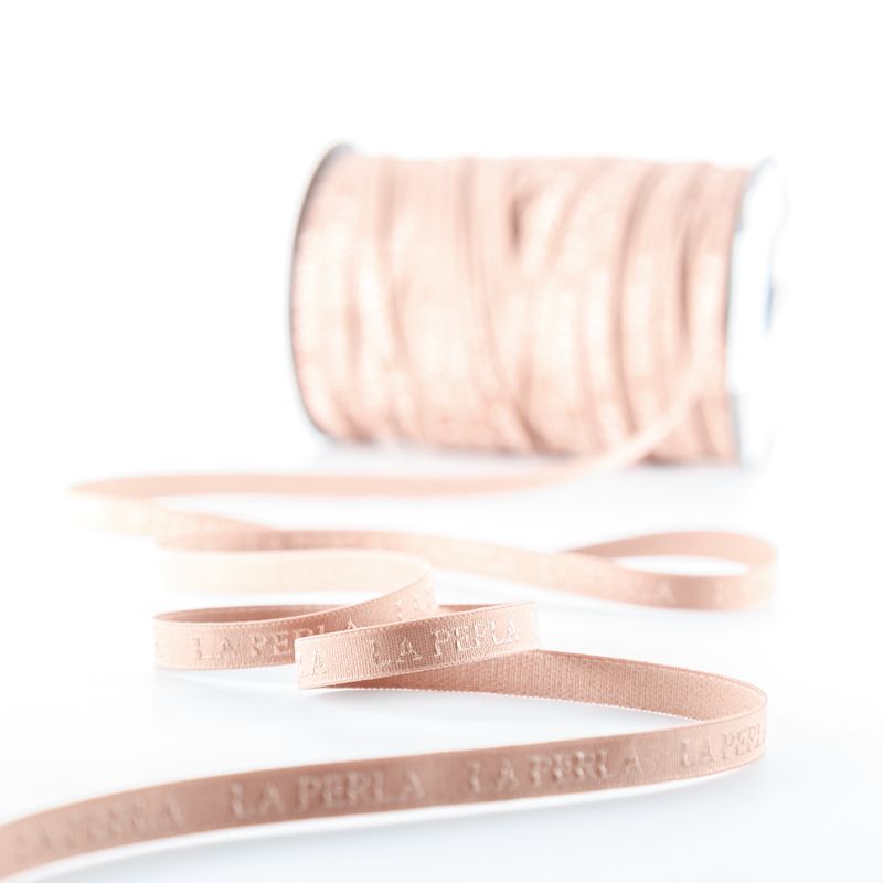 Бретелечная резинка используется для обработки стана бюстгальтера, а также для бретелей. Матовая с жаккардовой надписью бренда. Края ровные.