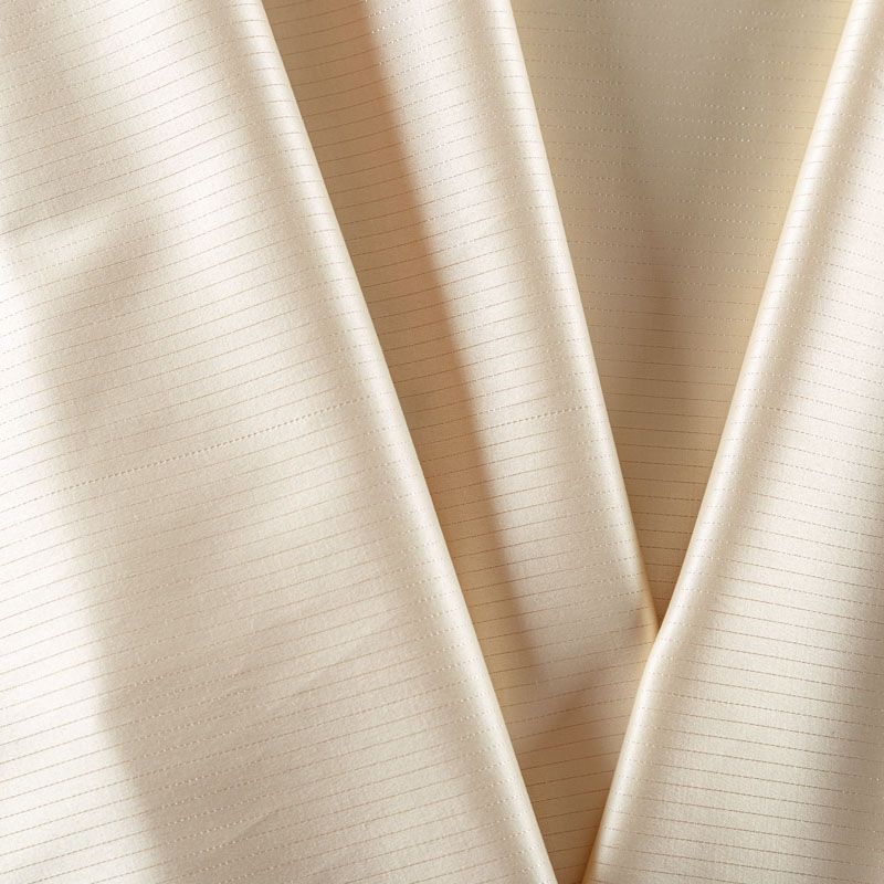 Сатин-коттон в бежевом оттенке с тонкими полосками люрексовой нити. Поверхность гладкая со сдержанным блеском, ткань средней плотности,  не толстая, хорошо держит форму, тянется за счет эластана в составе. Подойдет для пошива костюма, жакета, юбки, платья, брюк или шорт.