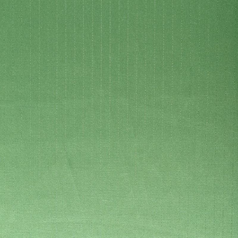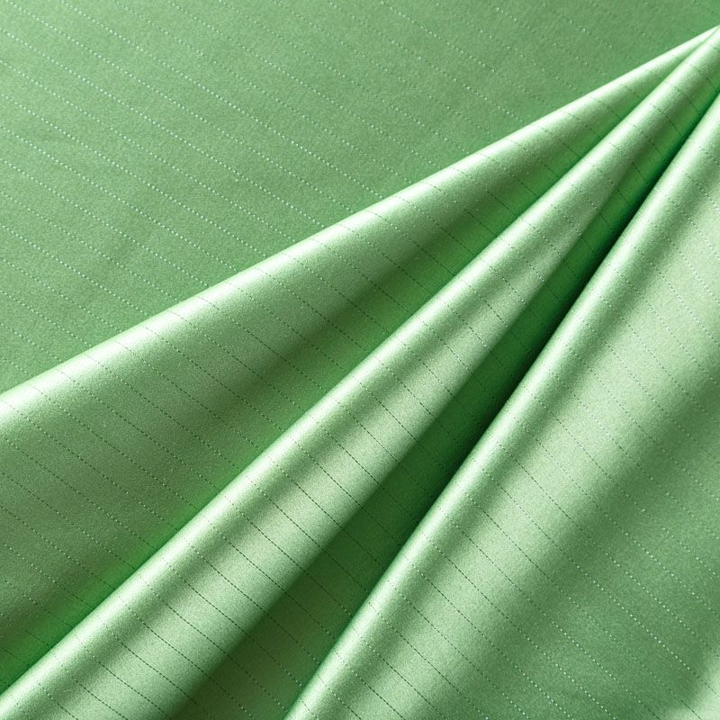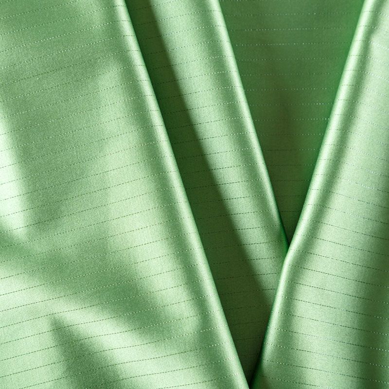 Сатин-коттон в зеленом оттенке с тонкими полосками люрексовой нити. Поверхность гладкая со сдержанным блеском, ткань средней плотности, не толстая, хорошо держит форму, тянется за счет эластана в составе. Подойдет для пошива костюма, жакета, юбки, платья, брюк или шорт.