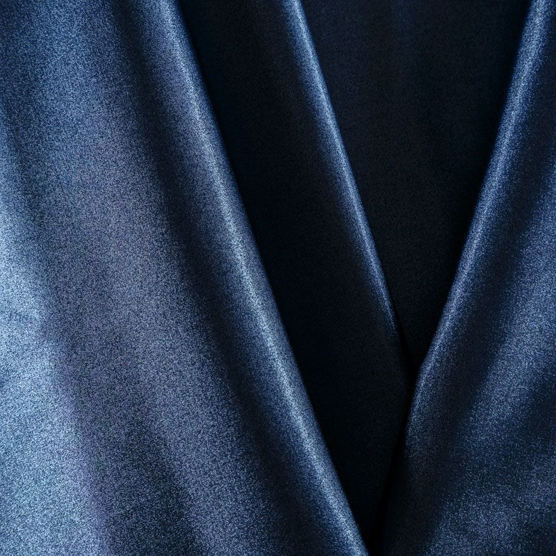 Итальянский сатин-коттон средней плотности в темно-синем оттенке с содержанием люрексовой нити. Поверхность ткань слегка шероховатая, с искрящимся блеском. Материал хорошо держит форму и драпируется, тянется за счет эластана в составе. Подойдет для пошива нарядных костюмов, платьев, жакета, юбки, брюк или шорт.