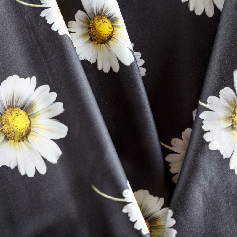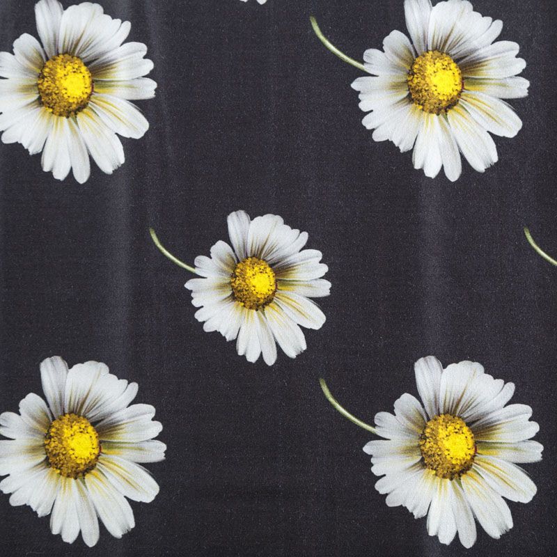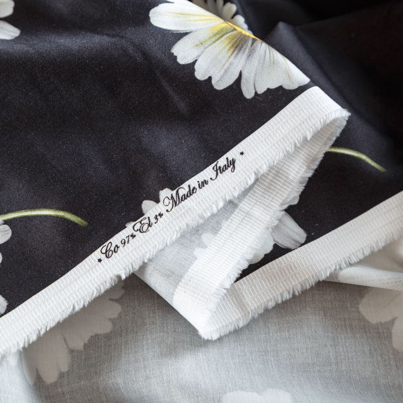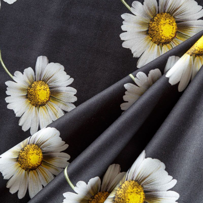 Итальянский сатин-коттон черного цвета с крупным цветочным принтом. Поверхность гладкая со сдержанным блеском, ткань средней плотности,  не толстая, хорошо держит форму, тянется за счет эластана в составе. Подойдет для пошива костюма, жакета, юбки, платья, брюк или шорт.