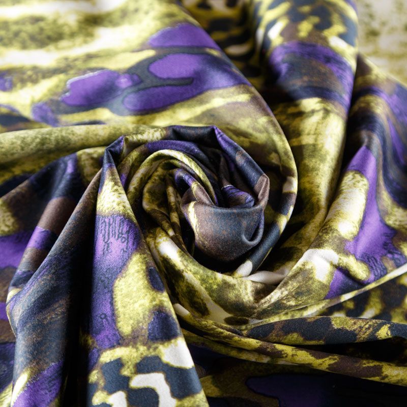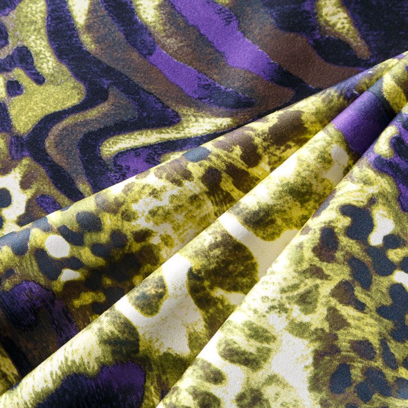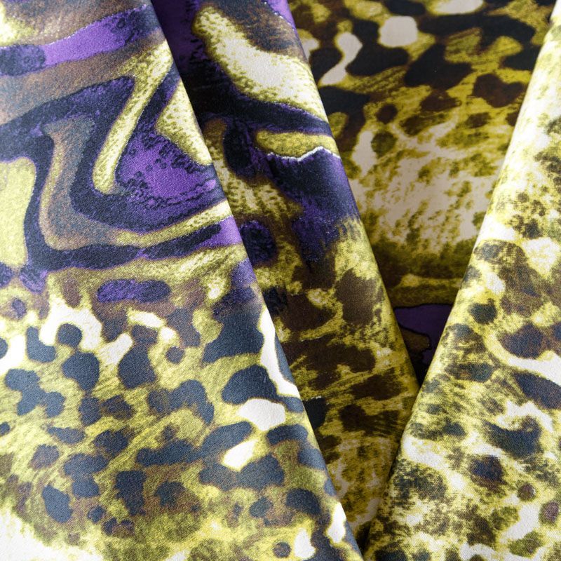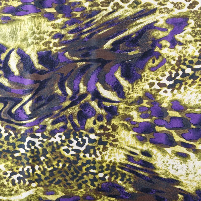 Итальянский сатин-коттон оливкового оттенка с контрастным анималистическим принтом. Поверхность гладкая со сдержанным блеском, ткань средней плотности,  не толстая, хорошо держит форму, тянется за счет эластана в составе. Подойдет для пошива костюма, жакета, юбки, платья, брюк или шорт.