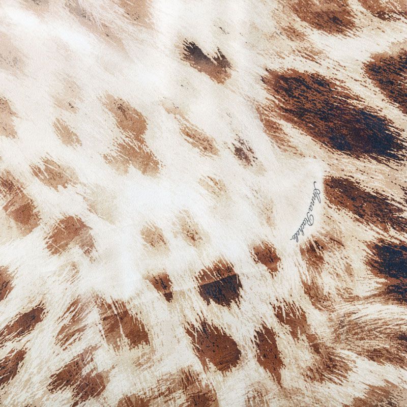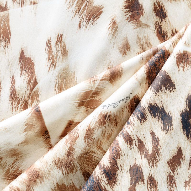 Итальянский сатин-коттон в молочном цвете с анималистическим принтом в природных оттенках. Поверхность гладкая со сдержанным блеском, ткань средней плотности,  не толстая, хорошо держит форму, тянется за счет эластана в составе. Подойдет для пошива костюма, жакета, юбки, платья, брюк или шорт.
