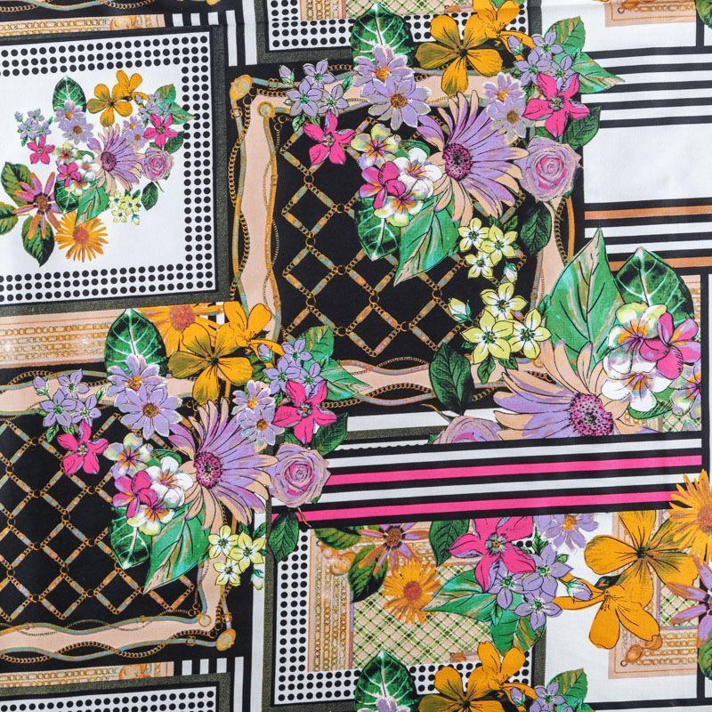 Сатин-коттон в белом цвете с абстрактно-цветочным принтом. Поверхность гладкая со сдержанным блеском, ткань средней плотности, не толстая, хорошо держит форму, тянется за счет эластана в составе. Подойдет для пошива костюма, жакета, юбки, платья, брюк или шорт.