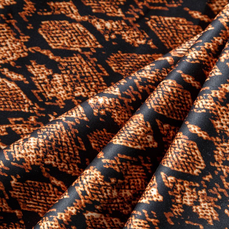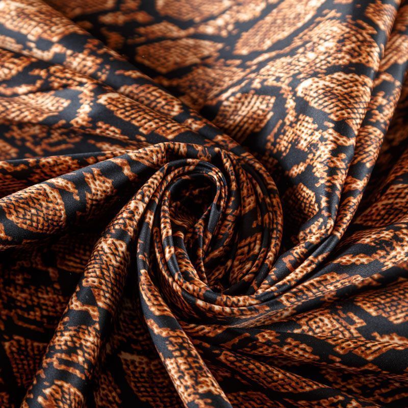 Сатин-коттон черного цвета со стилизованным анималистическим принтом, с гладкой поверхностью со сдержанным блеском, ткань средней плотности,  не толстая, хорошо держит форму, тянется за счет эластана в составе. Подойдет для пошива костюма, жакета, юбки, платья, брюк или шорт.