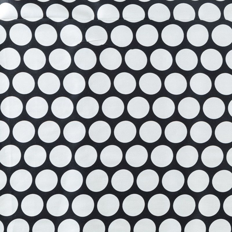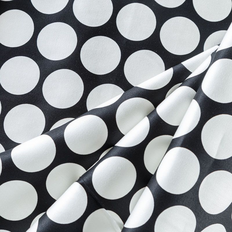 Сатин-коттон черного цвета с крупным принтом в горох, с гладкой поверхностью со сдержанным блеском, ткань средней плотности,  не толстая, хорошо держит форму, тянется за счет эластана в составе. Подойдет для пошива костюма, жакета, юбки, платья, брюк или шорт.