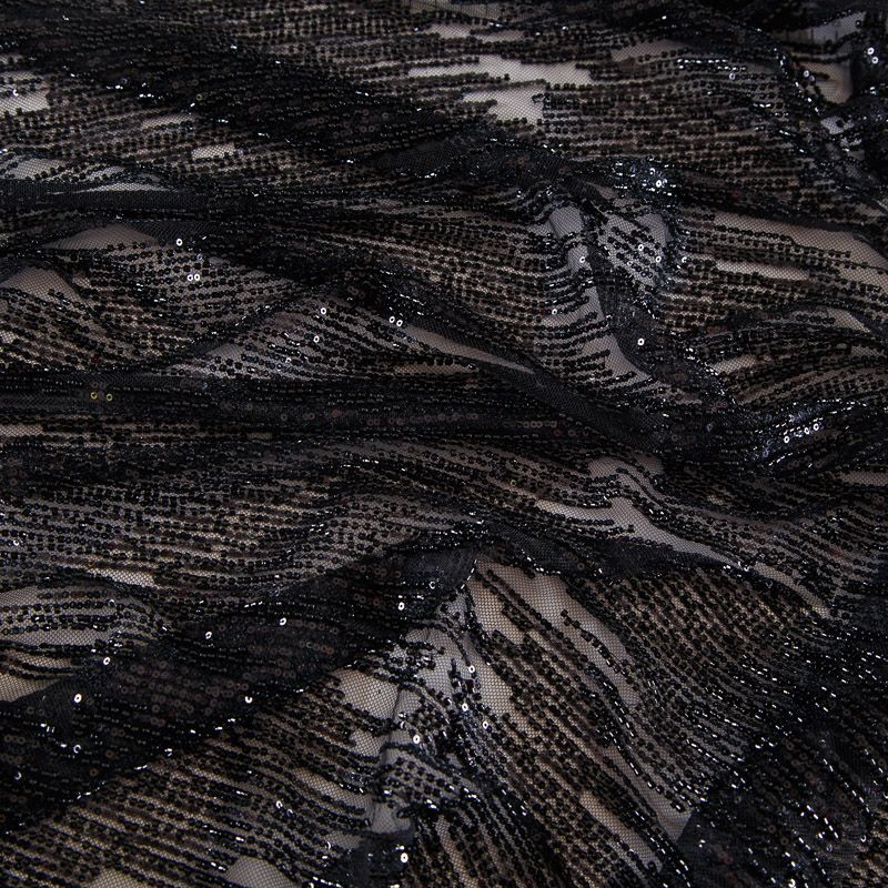 Мягкая сетка, густо расшитая пайетками и стеклярусом в тон полотна. Узор напоминает северное сияние, расположен по ширине полотна. Подходит для пошива нарядной одежды, платья, юбки, комбинезона. Требуется подклад, материал набирается объемом.