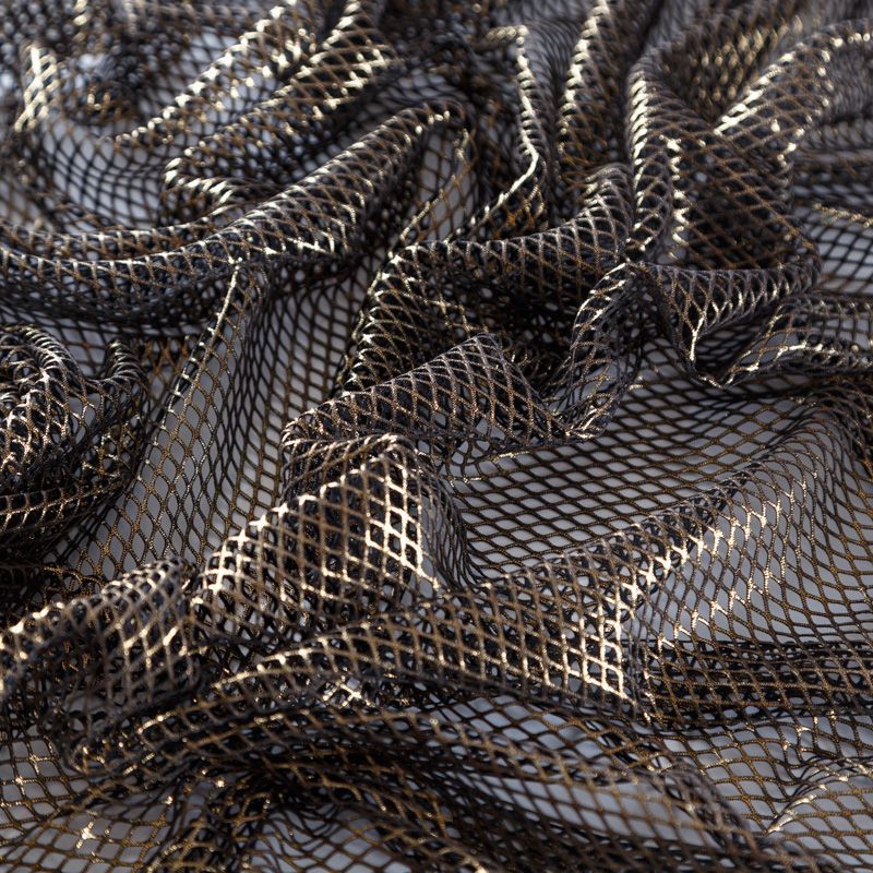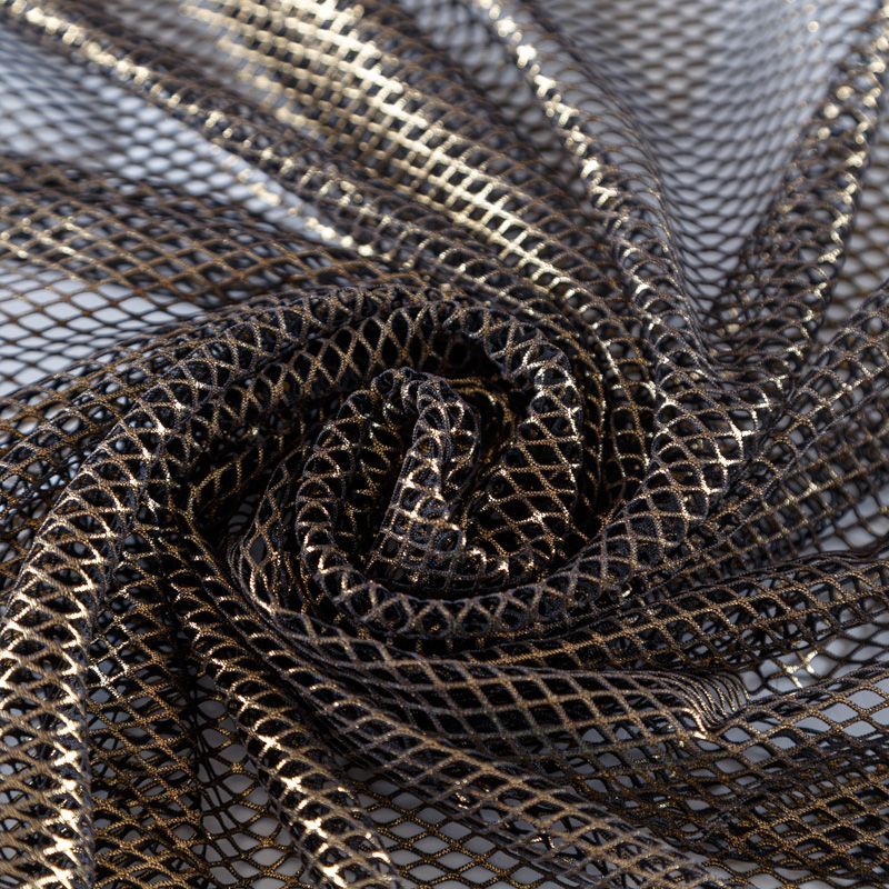 Рельефный полупрозрачный материал с сетчатой структурой. Поверхность полотна с металлизированным золотым напылением, которое придает материалу легкий блеск и мерцание. Полотно мягкое, растяжимое во всех направлениях. Сетки нашли свое применение в процессе пошива и последующего декора вечерних нарядов, свадебных платьев, спортивной одежды, театральных костюмов.