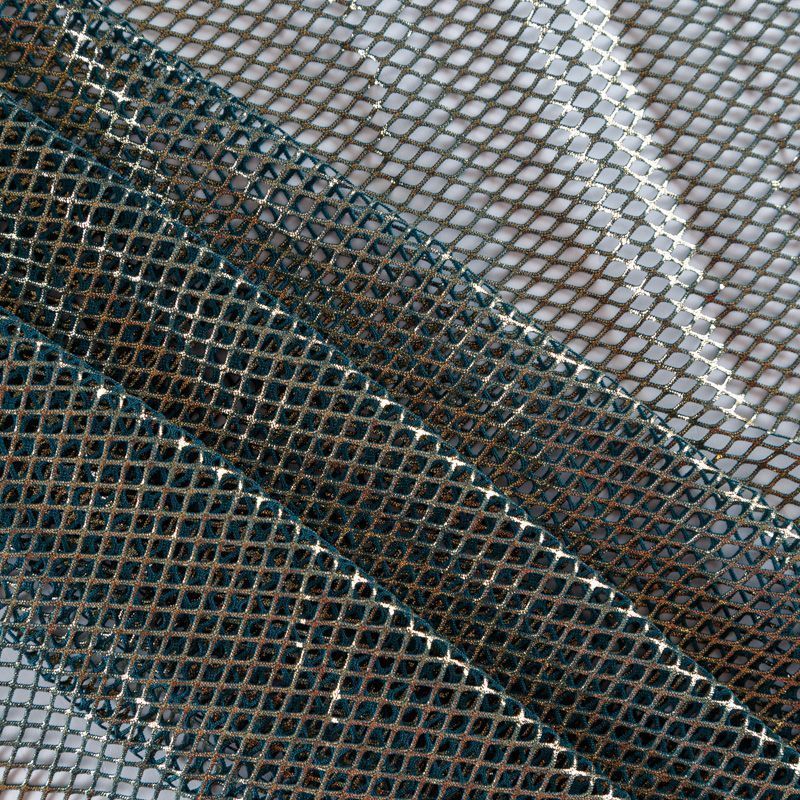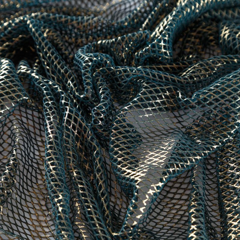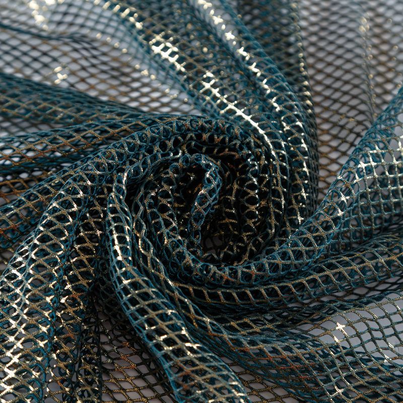 Рельефный полупрозрачный материал с сетчатой структурой. Поверхность полотна с металлизированным золотым напылением, которое придает материалу легкий блеск и мерцание. Полотно мягкое, растяжимое во всех направлениях. Сетки нашли свое применение в процессе пошива и последующего декора вечерних нарядов, свадебных платьев, спортивной одежды, театральных костюмов.