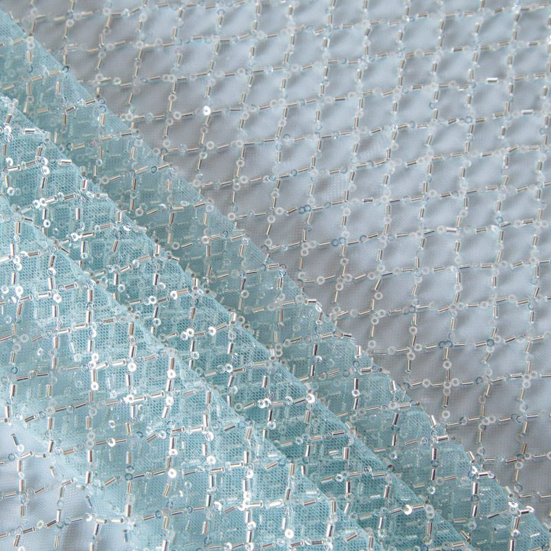 Эластичная мягкая сетка мятного оттенка, расшитая прозрачным стеклярусом. Геометрический дизайн делает полотно универсальным в использовании. Итальянская сетка прекрасно подходит для пошива праздничных нарядов, платьев, юбок и топов для торжественных случаев, а также отделки аксессуаров.