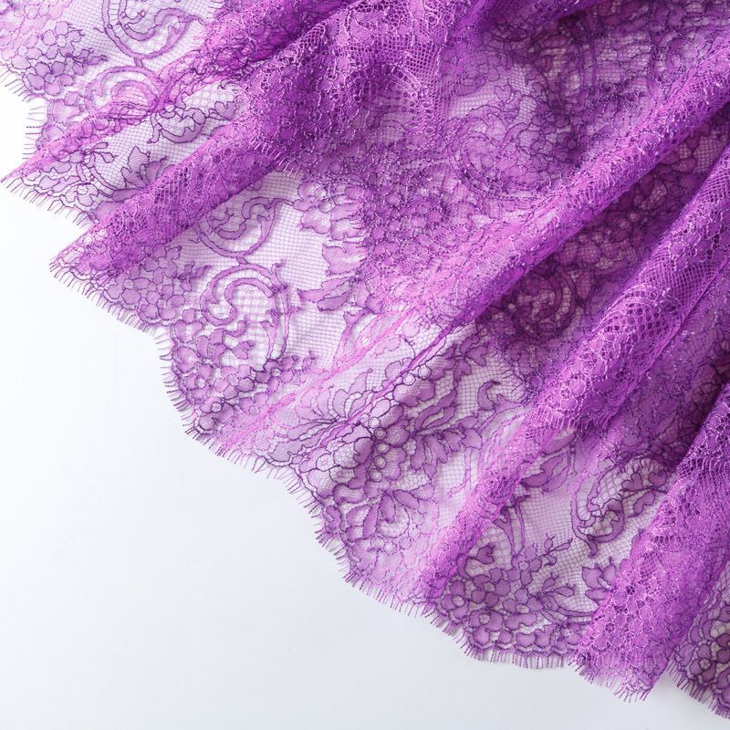Французское шантильи фиалкового оттенка имеет тончайшее плетение волокон и состоит из нежнейшего кружева, которое используется для пошива свадебных нарядов, праздничных платьев. Вставки из кружева украсят любой офисный костюм, повседневное платье, юбку, блузу. Обе кромки кружева украшены фигурными фестонами.