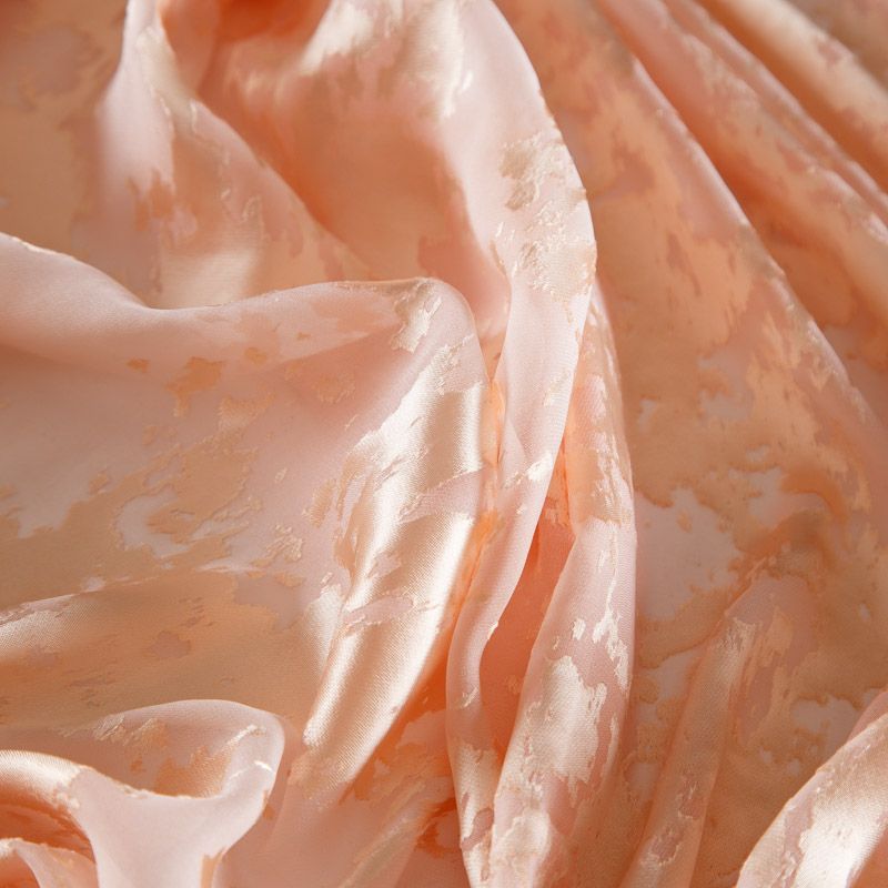 Итальянская полупрозрачная ткань из натурального шелка, созданная в технике "деворе" и олицетворяющая атласный мотив в персиковых оттенках на шифоне от бренда YSL. Материя мягкая и приятная на ощупь, пластично и воздушно драпируется - подойдет для вечерне-коктейльного платья или блузы.