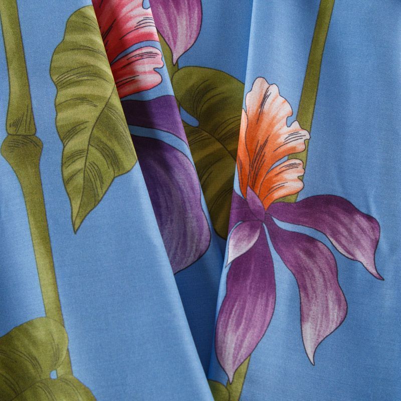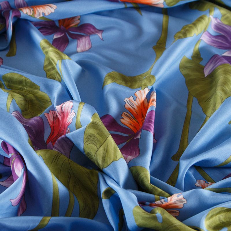 Итальянский шелк-батист в припыленном голубом оттенке с активным цветочным принтом. Ткань легкая, держит форму, отлично драпируется, поверхность шелковистая, матовая. Отличный вариант для пошива летнего гарбероба: платья, сарафана, рубашки, туники.
