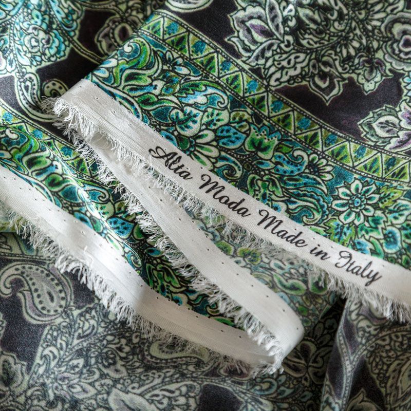 Итальянский атласный шелк с богатым орнаментом в зеленых оттенках.  Ткань тонкая, не просвечивает, отлично драпируется, легкая и струящаяся, тянется за счет эластана в составе. Идеально подойдет для пошива платьев и сарафанов расклешенных моделей, с воланами, летящих юбок, топов, блузки, костюма в пижамном стиле.