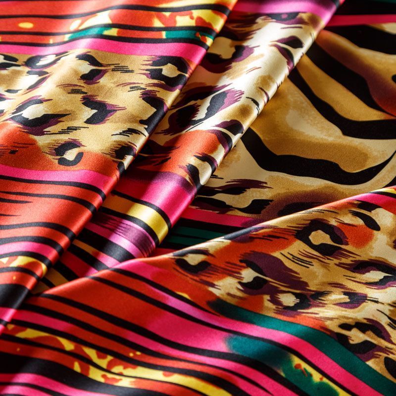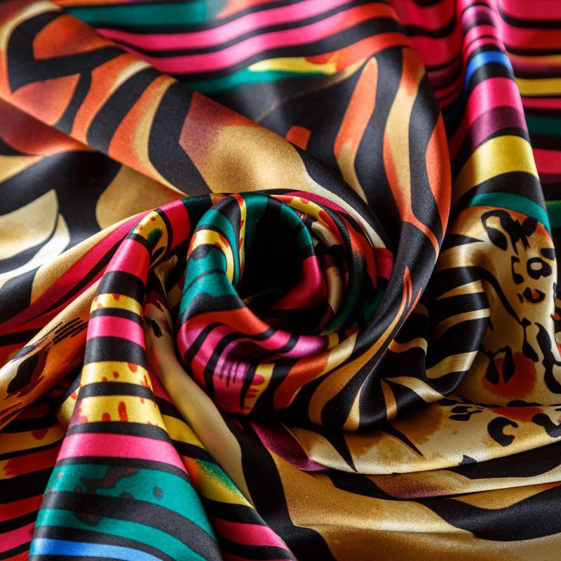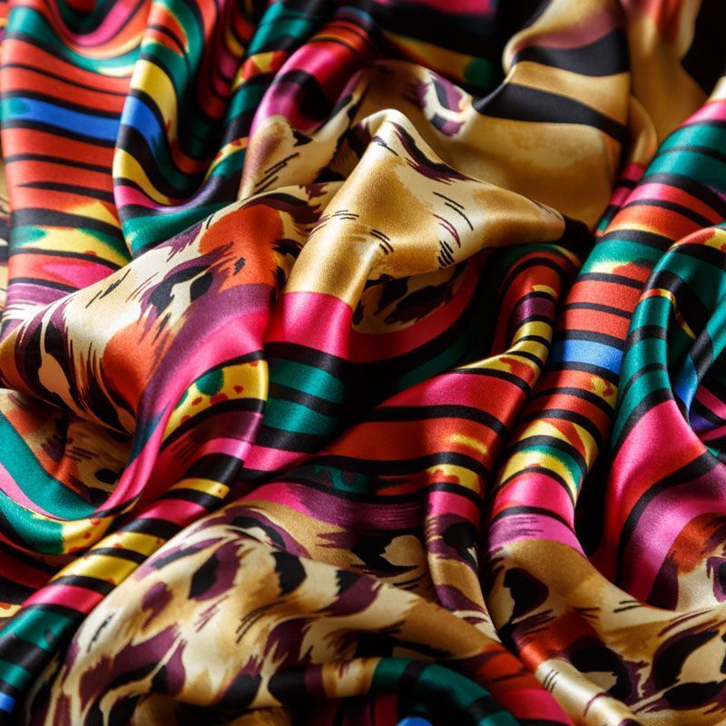 Итальянский атласный шелк с ярким абстрактным принтом на золотистом фоне. Ткань тонкая, не просвечивает, отлично драпируется,  легкая и струящаяся. Идеально подойдет для пошива платьев и сарафанов расклешенных моделей, с воланами, летящих юбок, топов, блузки, костюма в пижамном стиле.