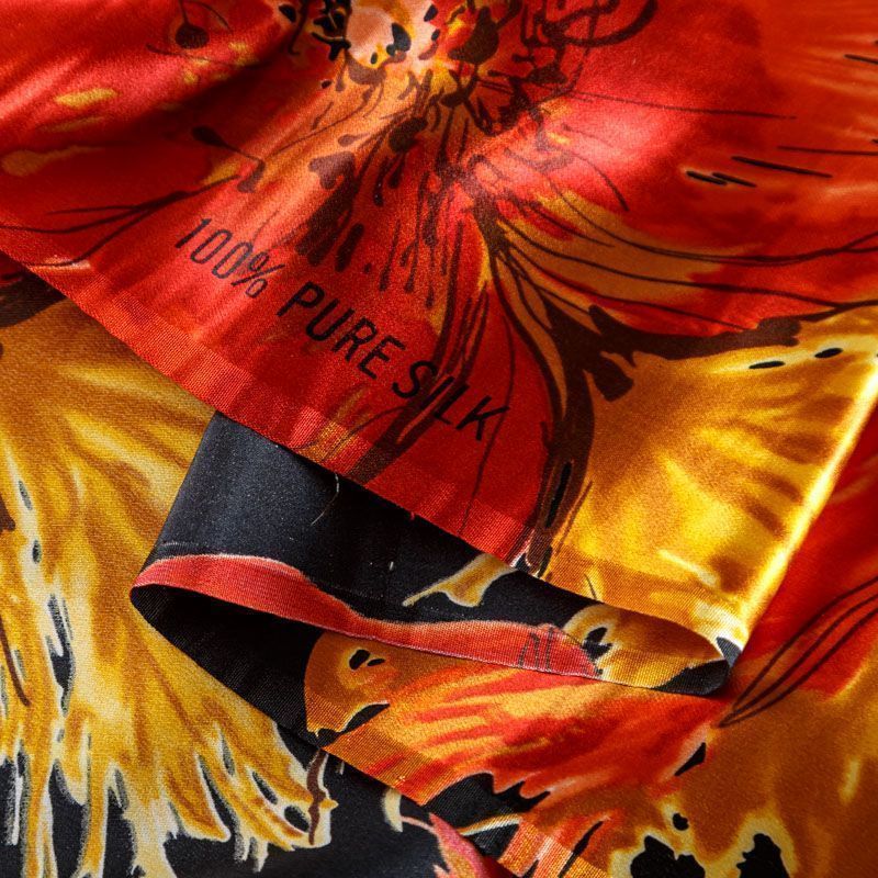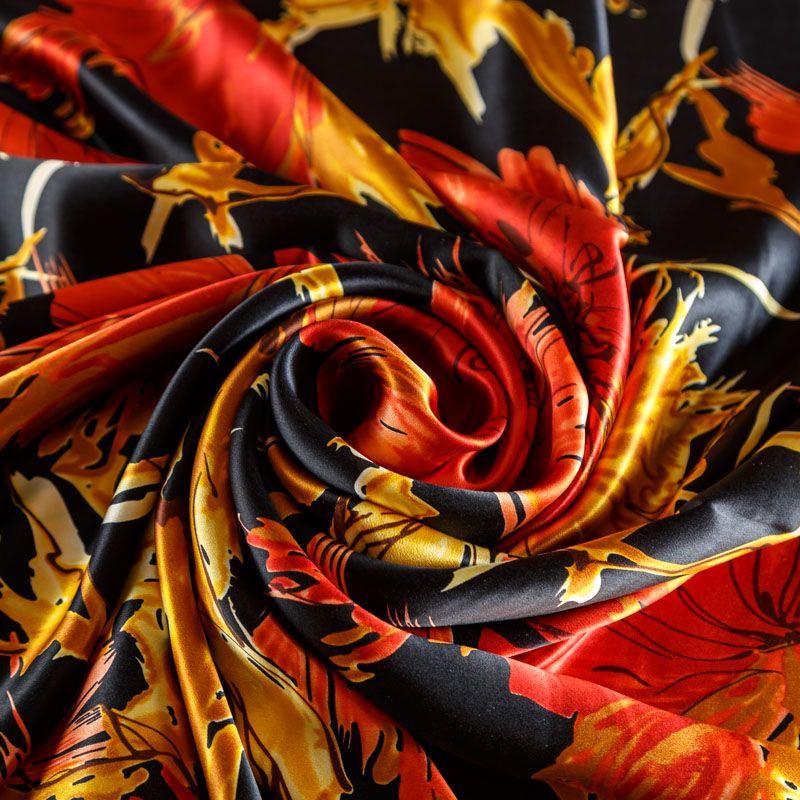 Итальянский атласный шелк с ярким цветочным принтом на черном фоне. Ткань тонкая, не просвечивает, отлично драпируется, легкая и струящаяся. Идеально подойдет для пошива платьев и сарафанов расклешенных моделей, с воланами, летящих юбок, топов, блузки, костюма в пижамном стиле.