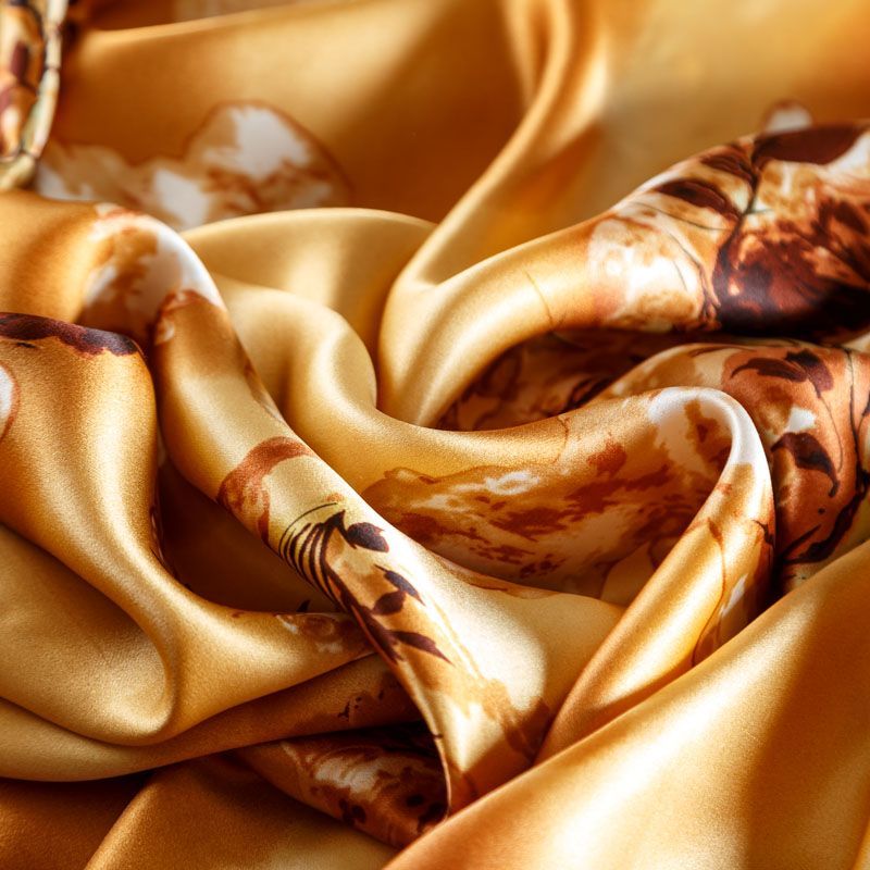 Итальянский атласный шелк с растительным принтом на золотисто-карамельном фоне. Ткань тонкая, не просвечивает, отлично драпируется, легкая и струящаяся. Идеально подойдет для пошива платьев и сарафанов расклешенных моделей, с воланами, летящих юбок, топов, блузки, костюма в пижамном стиле.