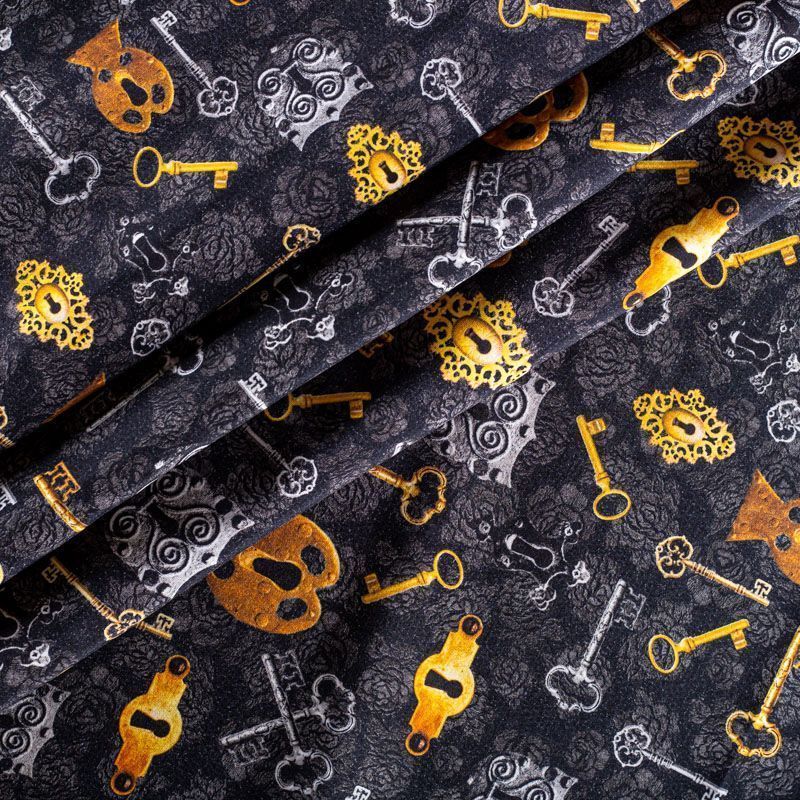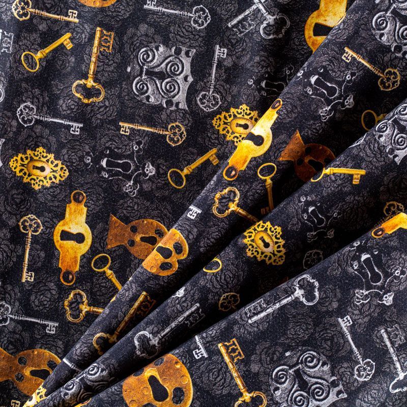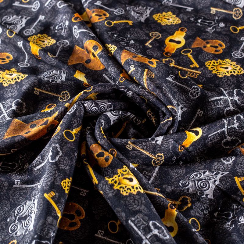 Итальянский матовый шелк насыщенного графитового оттенка с узнаваемым принтом от известного бренда. Ткань тонкая, не просвечивается, отлично драпируется, легкая и струящаяся, тянется за счет эластана в составе, лицевая сторона креповая, изнанка - атласная. Идеально подойдет для пошива платьев и сарафанов расклешенных моделей, с воланами, рюшами, летящих юбок, топов, блузки, рубашки, костюма в пижамном стиле.