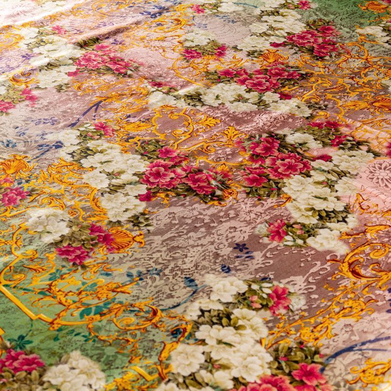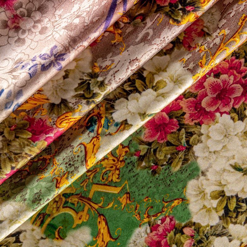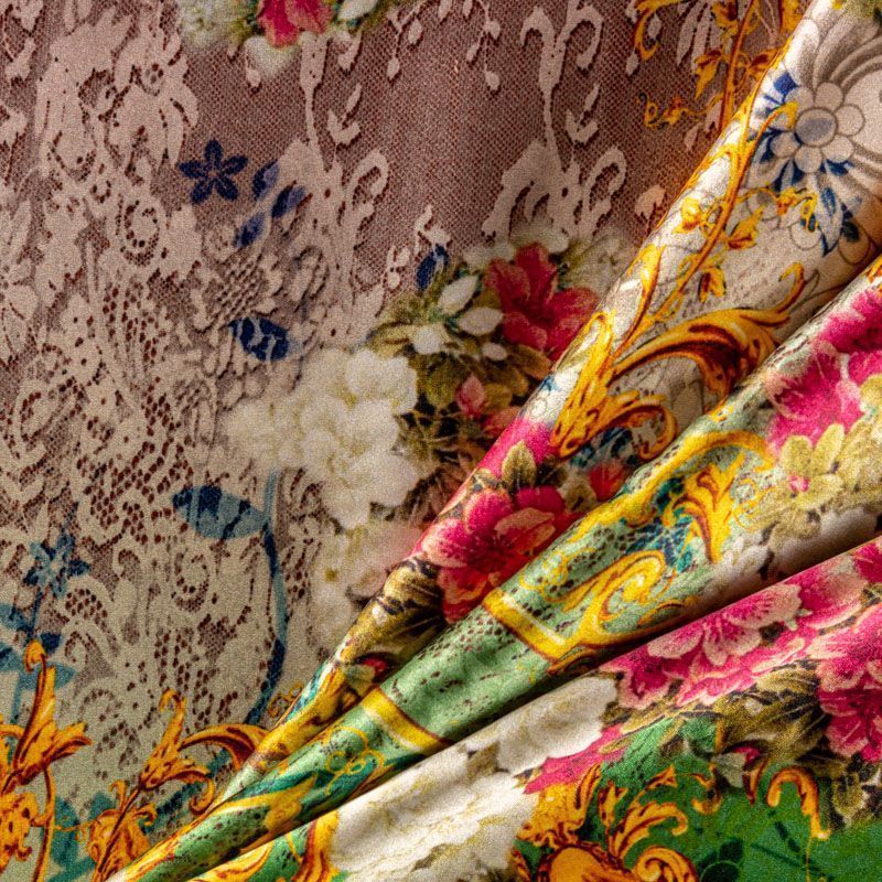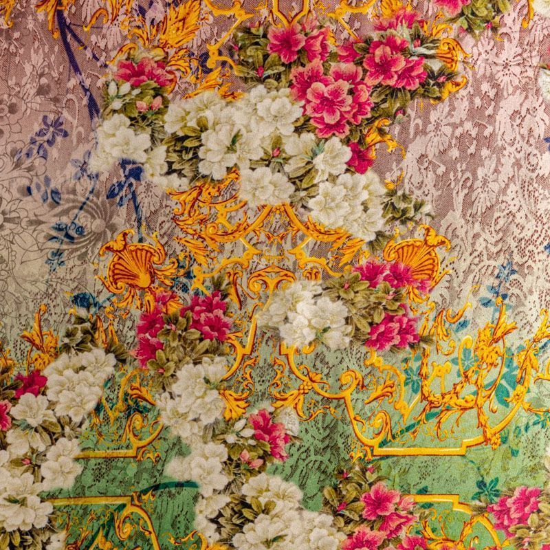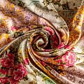 Итальянский атласный шелк с богатым цветочным принтом, дополненным акцентными вензелями в золоте, тонкий, не прозрачный, отлично драпируется, тянется за счет эластана в составе, легкий и струящийся. Идеально подойдет для пошива платьев и сарафанов расклешенных моделей, с воланами, летящих юбок, топов, блузки, костюма в пижамном стиле, домашней одежды.