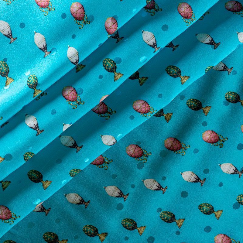 Итальянский шелк с матовой лицевой поверхностью и атласной изнанкой с принтом в виде миниатюр Фаберже на лазурно-голубом фоне, тонкий, не прозрачный, отлично драпируется, легкий и струящийся. Идеально подойдет для пошива платьев и сарафанов расклешенных моделей, с воланами, летящих юбок, топов, блузки, костюма в пижамном стиле.