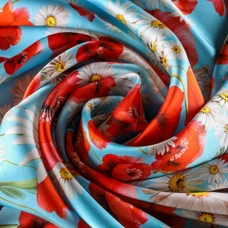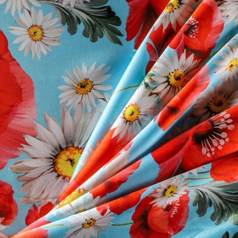 Итальянский атласный шелк, дизайн которого вдохновлен образом из коллекции известного бренда. На небесно-голубом фоне здесь - лаконичный и очень летний рисунок в виде ромашек и красных маков. Ткань средней плотности, не просвечивает, струится, хорошо драпируется. Поверхность глядкая, имеет благородный сатиновый блеск. Подойдет для летних платьев, накидок, юбок, блузок, костюмов, широких брюк, домашней одежды.
