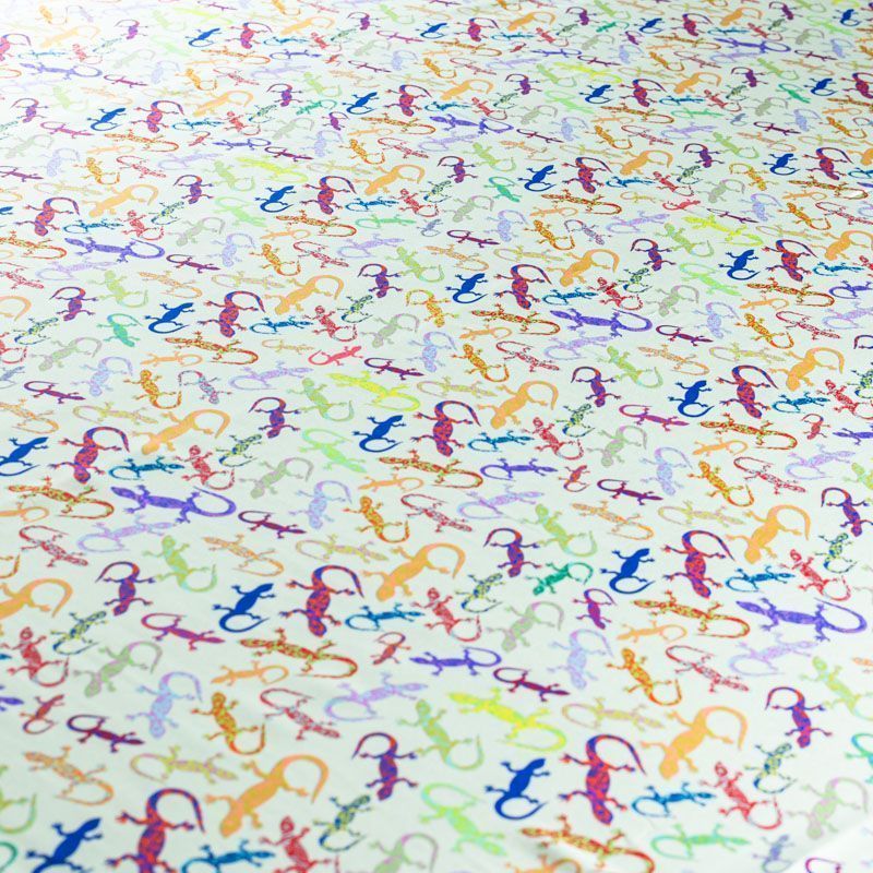 Итальянский шелк с матовой лицевой поверхностью и атласной изнанкой со стилизованными цветными ящерками на свежем светло-салатовом фоне, тонкий, слегка прозрачный, отлично драпируется, не много тянется за счет эластана в составе, легкий и струящийся. Идеально подойдет для пошива платьев и сарафанов расклешенных моделей, с воланами, летящих юбок, топов, блузки, костюма в пижамном стиле.